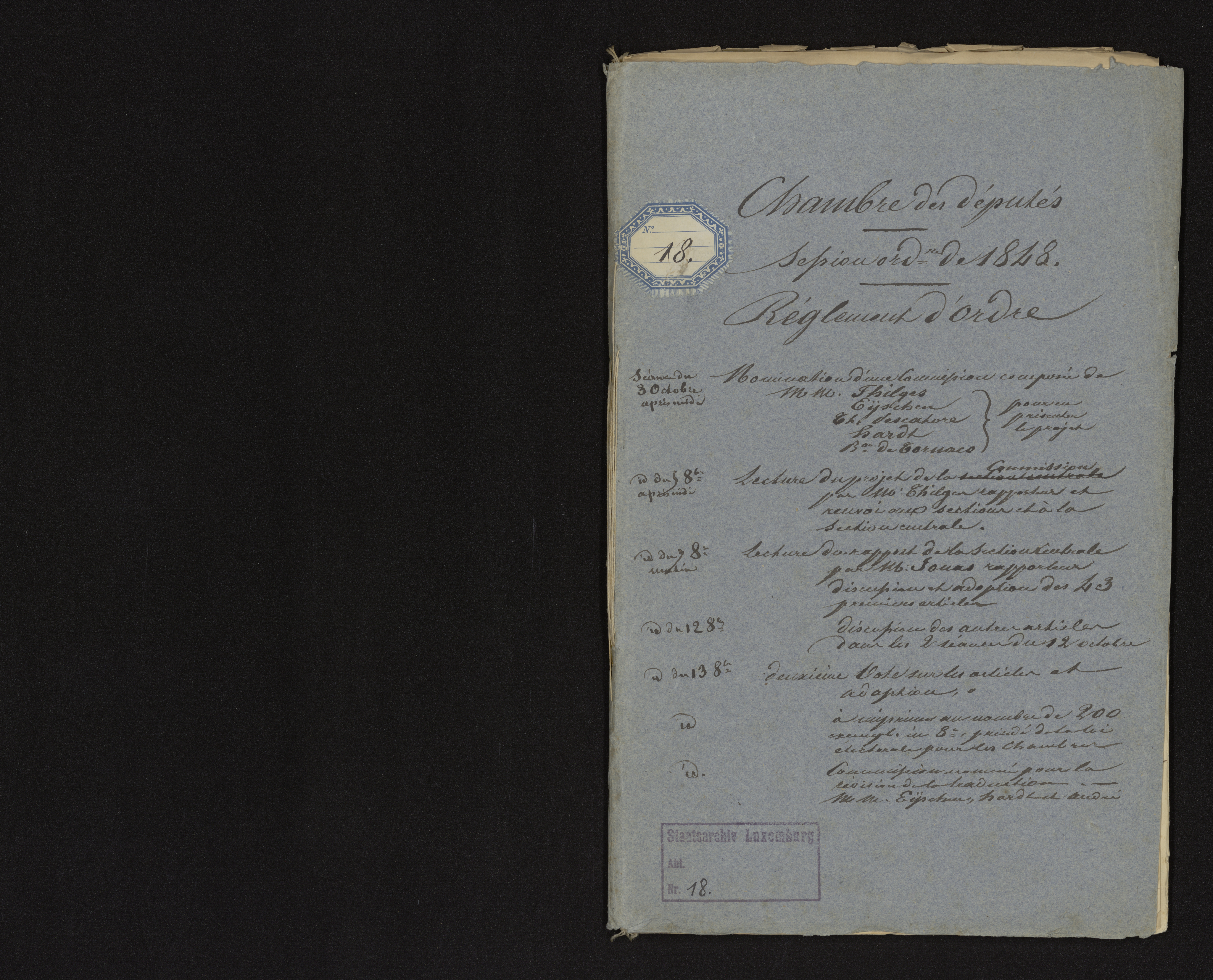 Dans le souci de faciliter l’accès aux sources historiques originales, la Chambre des Députés et les Archives nationales de Luxembourg (ANLux) ont mis en ligne plus de 184.000 scans d’archives du fonds de la Chambre des Députés. Ce fonds, conservé aux ANLux, s’étale de la création du Parlement luxembourgeois en 1848 jusqu’au début de la Deuxième Guerre mondiale. Il est composé de quelque 3.200 dossiers, soit environ 30 mètres linéaires.